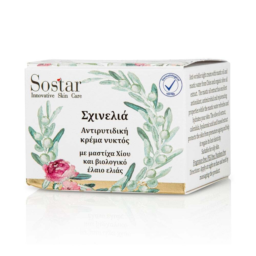 Η Σχινελιά Αντιρυτιδική Κρέμα Νυχτός της Sostar είναι εμπλουτισμένη με έλαιο μαστίχας, μαστιχόνερο και βιολογικό έλαιο ελιάς.